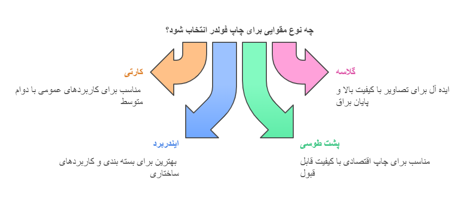 انواع مقوای کارتی، گلاسه، ایندربرد و پشت طوسی با گرماژ 200 گرم به بالا برای تولید و چاپ فولدر به کار می رود.