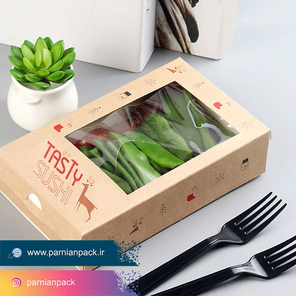 جعبه سالاد مربعی درب دار : ظرف ها با جنس مقوایی و به خواسته شما عزیزان قابل افزودن سلفون روی درب یا اطراف درب جعبه میباشد. طلق جعبه سالاد